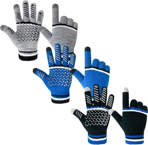 Migliore Wear 3 par barn vinterhandskar, pekskärm barn magiska handskar, barn stickade hela fingervantar, Halkskydd svart och blå och grå, 8-14 Years