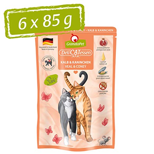 GranataPet Våtfoder Delicatessen kalv och kanin, 6 x 85 g, för katter, kattmat för finsmakare, foder utan spannmål och utan sockertillsatser