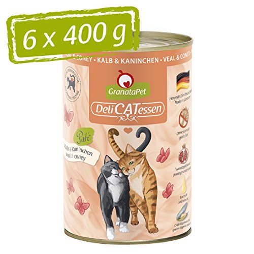 GranataPet Våtfoder Delicatessen kalv och kanin, för katter, kattmat för finsmakare, foder utan spannmål och utan sockertillsatser, 6 x 400 g