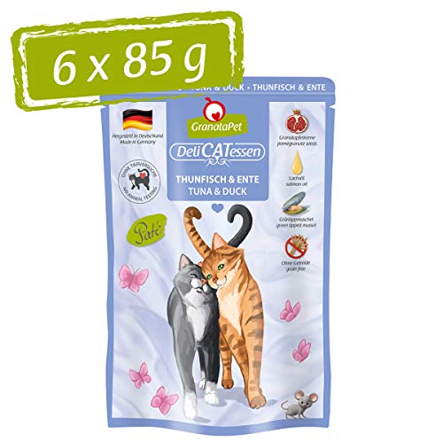 GranataPet Våtfoder Delicatessen tonfisk och anka, 6 x 85 g, för katter, kattmat för finsmakare, foder utan spannmål och utan sockertillsatser
