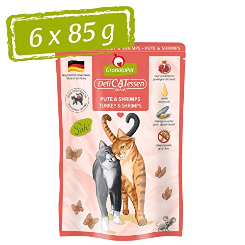 GranataPet Våtfoder Delicatessen kalkon och räkor, 6 x 85 g, för katter, kattmat för finsmakare, foder utan spannmål och utan sockertillsatser