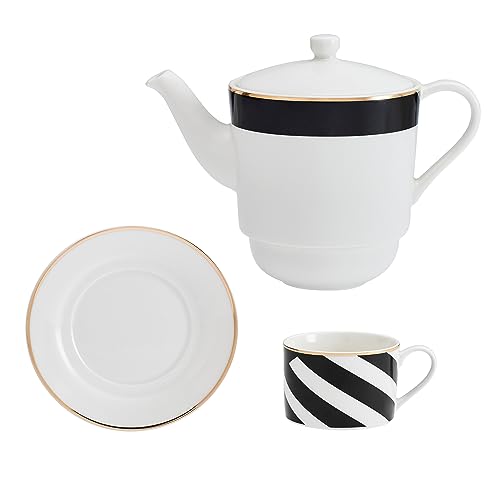 DUJUST 21 st litet te-set med 6, grå marmor, hantverk, gyllene kant, fint porslin tekanna set för barn och vuxna, 1 glas tekanna (64 oz), 6 koppar (113 gram), 6 fat, 6 skedar, 1 hylla och 1 värmare