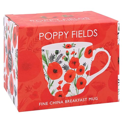 Mindre & Pavey Poppy Fields fint porslin frukostmugg - härlig röd & vit klassisk design presentidé - UK design - vår sommar dryckesartiklar