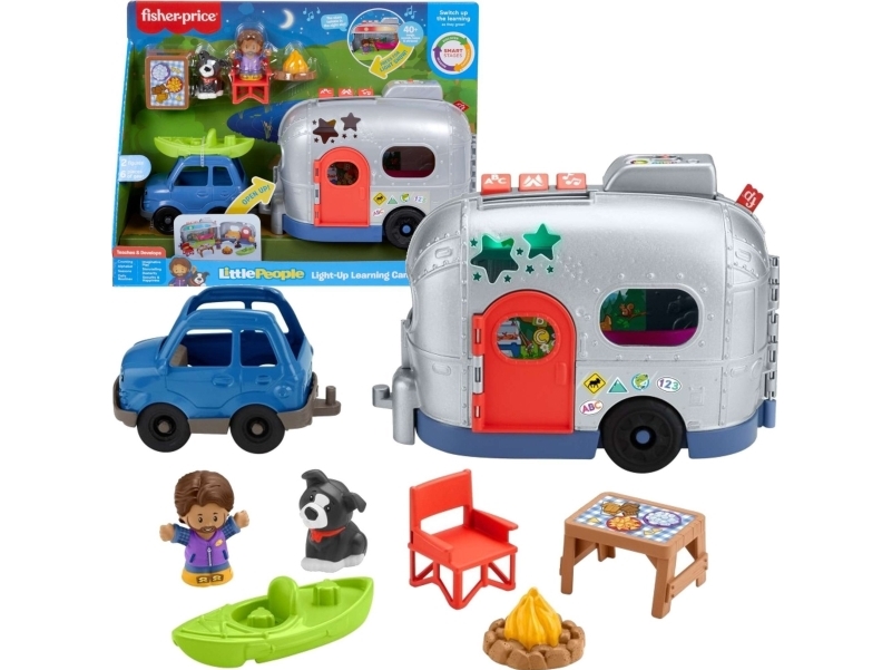 Fisher-Price HJN40 – Little People campingäventyr, interaktiv pedagogisk leksak med bil, husvagn och 2 figurer, med olika ljud och flerfärgade lampor för barn från 12 månader