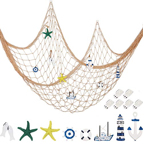 Decorative Fishnet Nautical Fishing Net Wall Hanging Decor, 8 Pieces Starfish, Sailboat, Lighthouse, Life Ring, Rudder, with Transparent Hook for Mermaid Mediterranean Party (Creamy White)
