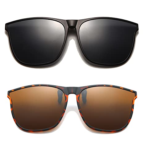 Long Keeper polariserade solglasögon med klämma – solglasögon med klämma på glasögon för män kvinnor, stor ram clip-on flip up solglasögon för körning, fiske utomhus, Svart grå + leopard brun