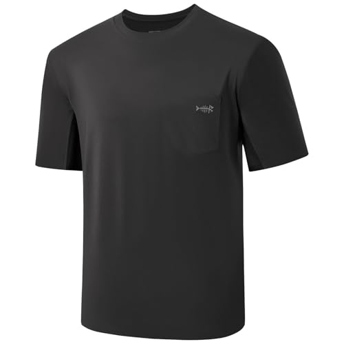 Bassdash herr UPF 50+ prestanda kortärmad ficka t-shirt UV solskydd fiske vandring kajakpaddling sporttröjor, Mörkgrå/grå logotyp, XL