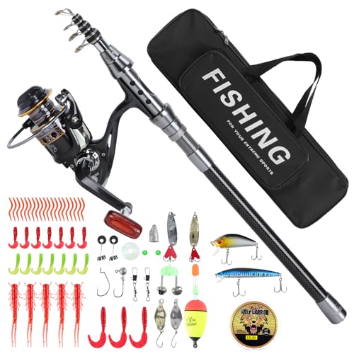 FISHOAKY Teleskopiskt fiskespö och rulle Combo, kolfiber spinning spö med rulle med lina, krokar för saltvattning och sötvatten, barn och vuxna