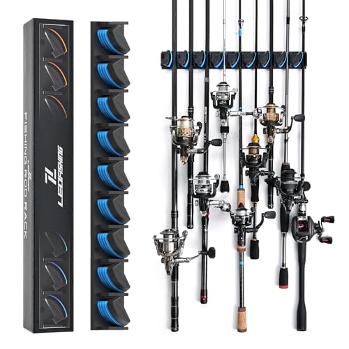 LEOFISHING Vertikal horisontell fiskespöhållare väggmonterad fiskespöhållare rymmer upp till 9 spön eller kombinationer fiskespö stånghållare för garage takmonterad passar de flesta spön (blå-1-pack)