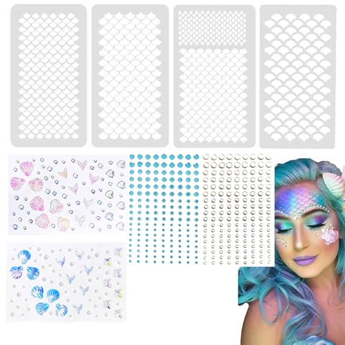 Amacoam Fiskfjäll stenciler sjöjungfru kostym make-up stenciler sjöjungfru mallar med 4 x glitterstenar självhäftande strasstenar karneval kostym makeup karneval målning mall för målning