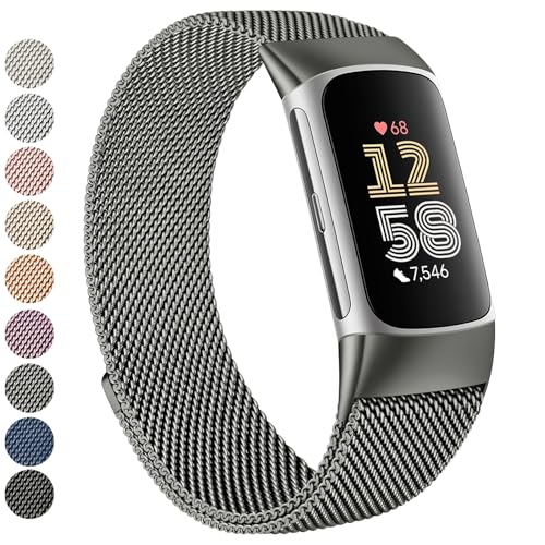 Vanjua för Fitbit Charge 6 / Charge 5 band kvinnor män, rostfritt stål metall nätögla justerbar magnetiskt armband ersättningsrem kompatibel med Fitbit Charge 6 / Charge 5 fitnessmätare, En storlek