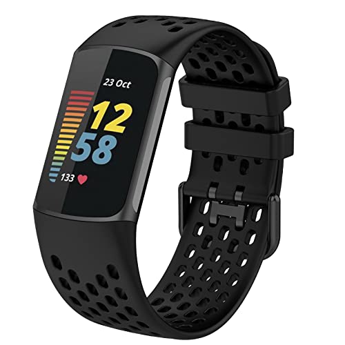 FunBand Remmar kompatibla med Fitbit Charge 5 rem, mjukt silikon, sport, andningsbart, vattentätt, ersättningsband, justerbart, armband, passar för Fitbit Charge 5 aktivitetsmätare, för kvinnor, män, svart