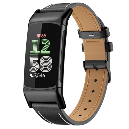 MoKo Leather Strap Compatible with Fitbit Charge 6/Fitbit Charge 5 for Women Men, Genuine Leather Watch Band Replacement Wristband, Black