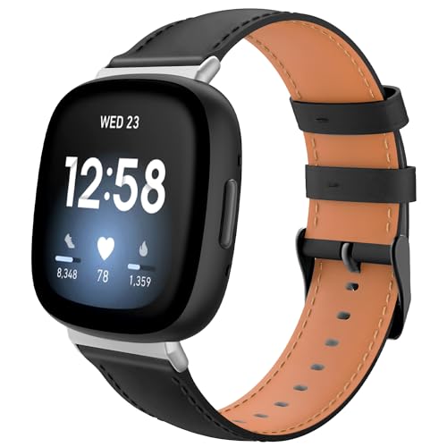 TiMOVO Leather Strap Compatible with Fitbit Versa 4/Fitbit Versa 3/Fitbit Sense 2/Sense Watch Bands, Top Grain Genuine Classic Leather Replacement Wristbands Straps for Women Men, Black