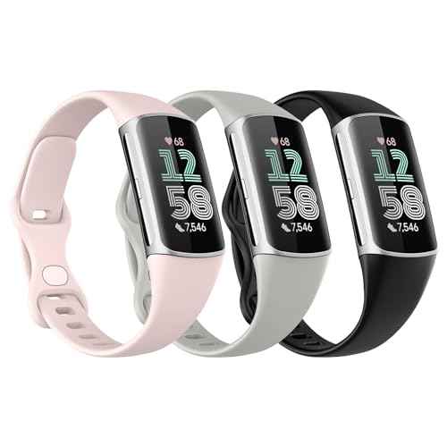 Astorgos 3 Pack Slim Straps Compatible with Fitbit Charge 6/Charge 5 for Women Men, Soft TPE Watch Strap Thin Band Replacement Wristband, Black/Rock Gray/Sand Pink