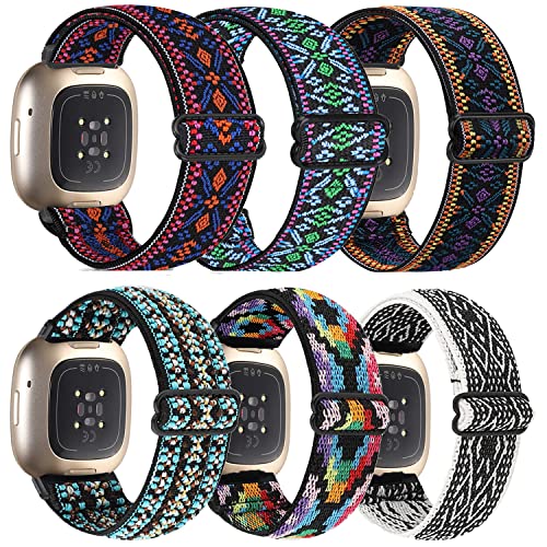 HUYIIO 6-pack elastiska nylonremmar kompatibla med Fitbit Versa 3/Sense, justerbara ersättningsband i nylon för Fitbit Versa Smart Watch för kvinnor och män, 4.5"-9.5" (One Size Fits Most), Nylon