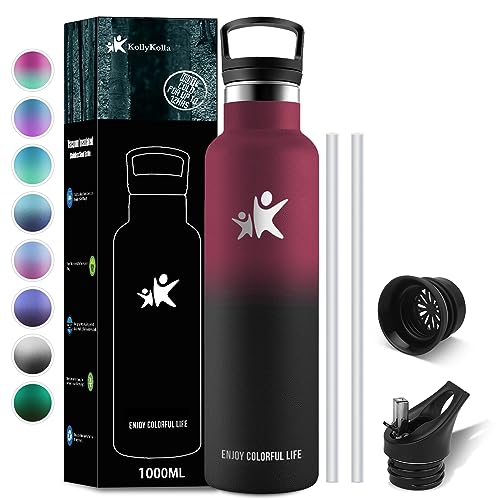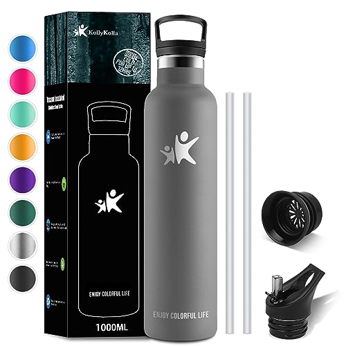 KollyKolla Termosflaska 1 l lämplig för kolsyra, vattenflaska i rostfritt stål med sugrör, termoskanna BPA-fri, vakuumflaska, läckagesäker, vattenflaska för fitness, skola, utomhus, sport, gym