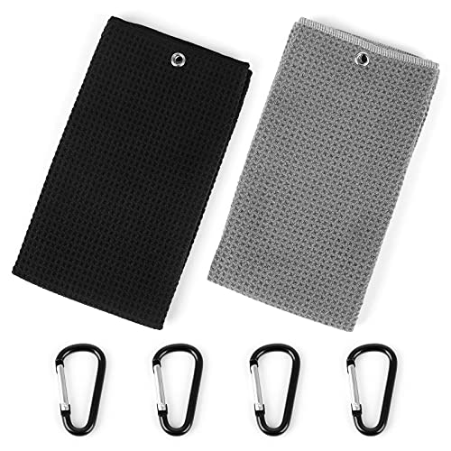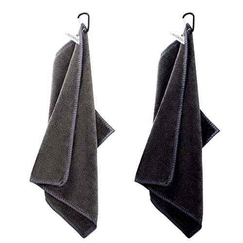 Dadabig 2 stycken golfhanddukar i mikrofiber med 4 klämmor, 40 x 50 cm, tri-vikbar, sporthandduk för sport utomhus fitness yoga cykel, svart/grå