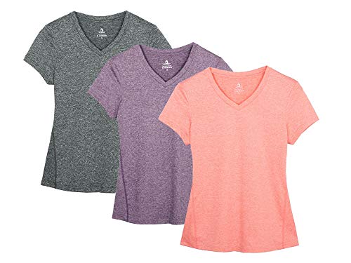 icyzone Dam sport fitness t-shirt kortärmad v-ringad löpartröja kortärmad yoga topp 3-pack, Kol/lavender/persika, S