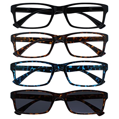OPULIZE PEP läsglasögon för kvinnor män, stor rektangulär designerram med fjädergångjärn, repbeständiga, svart, brun, blå, brun sol +2,5 (förpackning med 4)