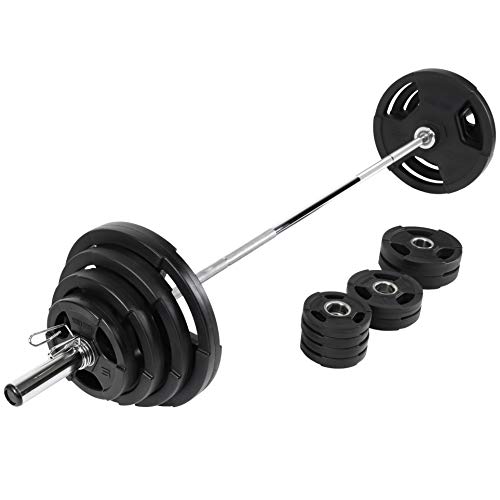 GORILLA SPORTS® skivstångsset Olympia - 130 kg vikter och skivstång 218 cm, 50 mm, med fjäderlås, räfflade, krom, viktskivor i plast - hantelset, viktskivor, hantlar