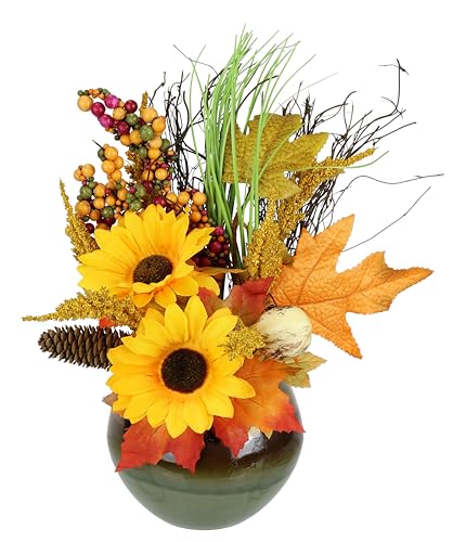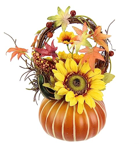 Flair Flower arrangemang med konstgjorda blommor solros bär höstlöv i pumpa konstgjorda blommor dekorativa blommor höstdekoration höstblommor sidenblommor arrangemang bordsdekoration, 15 cm