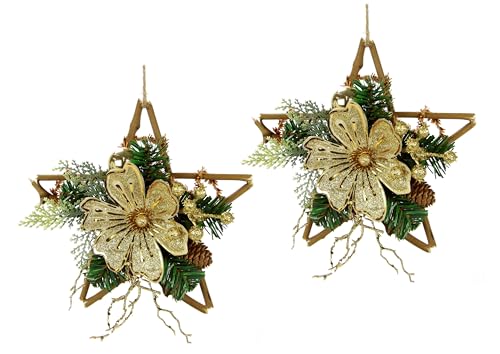 Rottingstjärna dekorerad med magnolia, riktiga kottar, grangrenar, bär, julgranskula, dekorativa grenar, rosett för hängande julstjärna, dörrdekoration, vägg, trästjärna, juldekoration set om 2