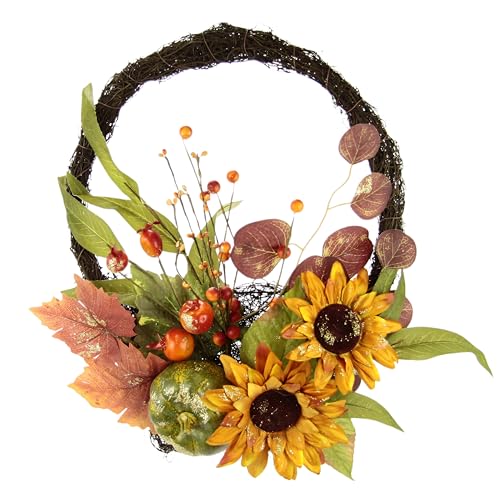 Höstkrans av rotting för ytterdörren med solrosor bär pumpa höstlöv dekorationer höst dörrkrans dörrdekoration höstdekoration för halloween skördefest skörda hem utomhus och inomhus