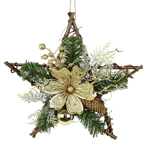 Stjärna med LED-belysning av metall, dekorerad med grangrenar, rosett, kottar bär för att hänga ljusstjärna, julgransprydnad, dörrdekoration, vägg, juldekoration 3D-dekoration, ornament, julstjärna