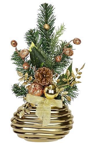 Minijulgran i vas, juldekoration med julgranskulor, bär, äpple, grangrenar, julgran, juldekoration inredning, konstgjord växt, deskalle, inomhusväxt, bordsdekoration