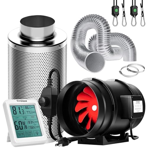 VIVOSUN Inline-fläkt 6 tum 390 CFM med hastighetsstyrenhet, 15 cm kolfilter och 20 cm kanaler, temperaturfuktighetsmätare för ventilation av växttält, luftfiltreringssats