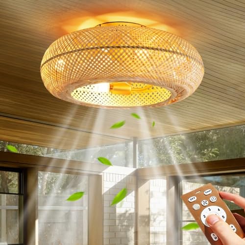 Takfläkt med lampa och fjärrkontroll tyst retro E27-fläkt taklampa rotting bambu fläkt lampa för sovrum vardagsrum matsal kök kontor lampa, 6 hastigheter med timer
