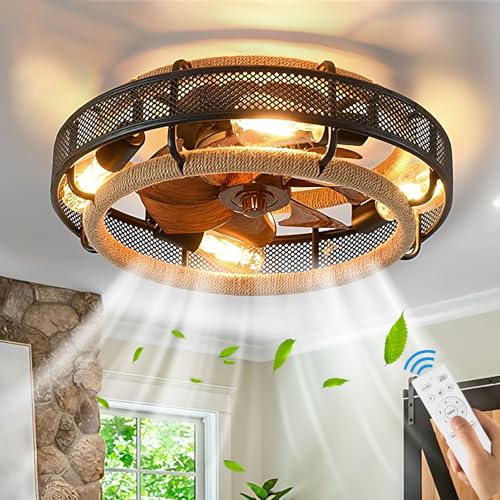 Takfläkt med belysning och fjärrkontroll E27 retro hamparep ljus tyst fläkt 6-växlad vändbar motorljus med fläkt för vardagsrum sovrum matsal, 50 cm