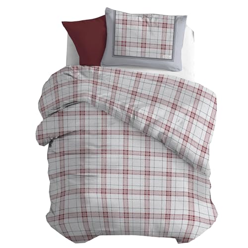 PENSIERI DELICATI Parure Påslakan Dubbel Flanell 100% Bomull, Påse 250X200 CM och örngott 52X82 CM, Tillverkad i Italien, 40° Maskintvättbart Påslakan Kanada-Mönstrad Röd