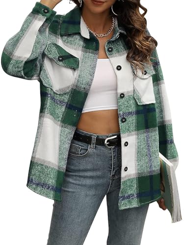 AUTOMET Womens Fall Outfits Fashion Clothes Shackets Flannel Plaid Button Down Long Sleeve Shirts Jackets Light Green S