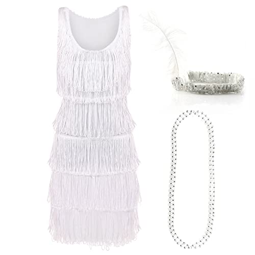 DAMER DELUXE FLAPPER KOSTYM – VIT 1920-tals FLAPPER KLÄNNING MED FRAMSIDA OCH BAKGRÄNSNING + matchande paljetthuvuddel – 1920-tals CHARLESTON FANCY KLÄNNING (MEDIUM)