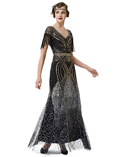 BABEYOND Women's Flapper Dress 1920s V-Neck Evening Gown Sequin Beaded Maxi Dress for Wedding Black Gold