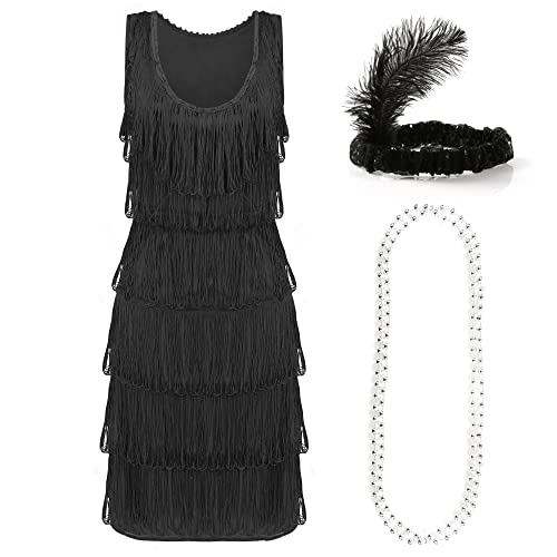 BABEYOND Flapper-klänningar dam, 1920-tal, pärlad, fransig, Great Gatsby-klänning, Svart, L