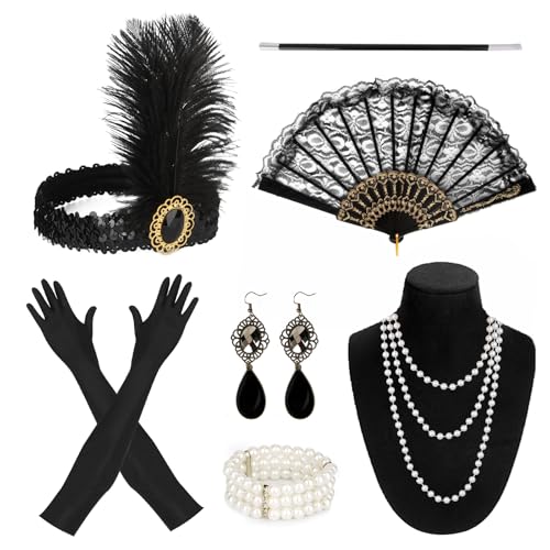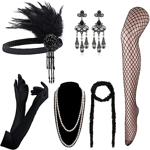 PLULON 7 delar 1920-talet flapper Great Gatsby tillbehör set mode roaring 20-tal tema set med pannband långa svarta handskar halsband örhängen för dam (stil 5)