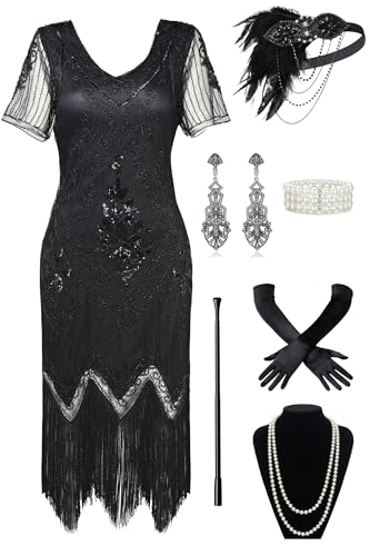 PLULON 1920-talet paljettpärlor fransar flapper-klänning med 20-tals tillbehörsset, Mörksvart guld, M