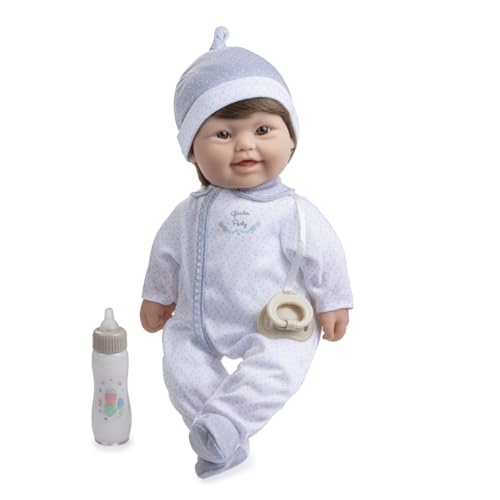 JC TOYS - Down The Baby syndrom docka 40 cm, mjuk och tvättbar kropp, brunt hår, magisk flaska och napp, grå och vit, designad i Spanien, +12 månader