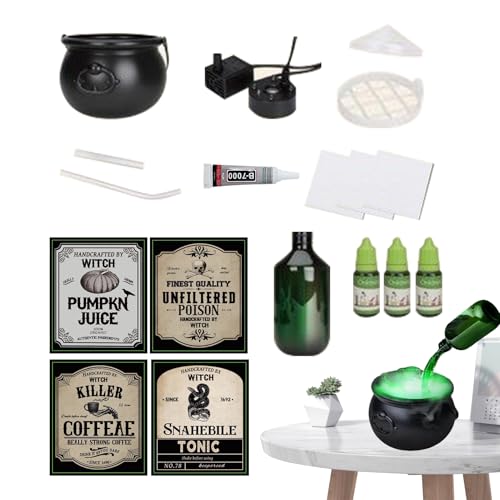 Halloween Cauldron, häxkauldron med flytande potion flaska, diffuser med grön mist, LED ljus, inomhus halloween dekoration, höst festival prop, hängande husskärm, bakgårdsdekor