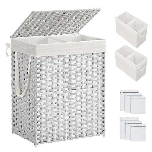 SONGMICS Tvättkorg med lock, 90 l, klädkorg med 2 urtagbara foderväskor, 6 nätväskor, flätad tvättkorg, dubbel tvättkorg för badrum, 33 x 46 x 60 cm, vit, ULCB251W01V1