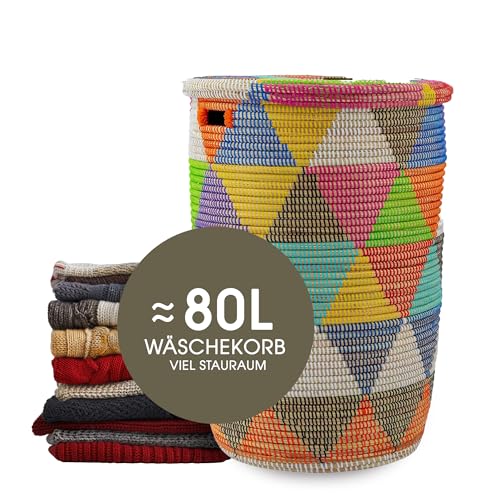 YAADU Tvättkorg med lock 80 l – stor tvättkorg med lock, flätad tvättkorg, boho-tvättkorg med handtag, tvättbehållare för smutstvätt, modell Khaliss (färgglad triangulär platt)