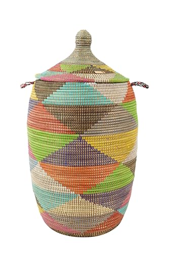 Traditionell afrikansk tvättkorg – Gueno – XXL-korg – flätad – handgjord – tillverkad i Afrika – höjd utan lock mätt ca 60 cm (triangel-färgglad)