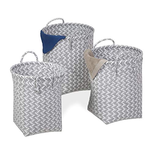 Relaxdays Flätad tvättkorg, uppsättning av 3 förvaringskorgar, 3 storlekar, leksakskorg med handtag, plast, vit/grå