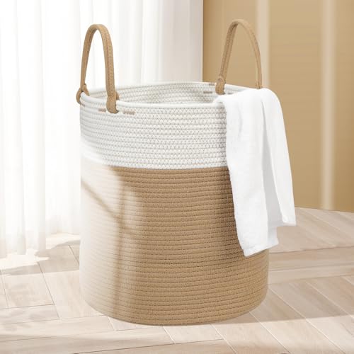 VIPOSCO Tvättkorg, stor, hög flätad repförvaringskorg för filtar, leksaker och smutstvätt i vardagsrum, badrum och sovrum, 72 l, vit och brun
