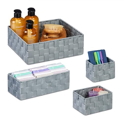 Relaxdays Förvaringskorg set om 4, olika storlekar, flätade korgar, badrum, dekorativ korg, plast, grå