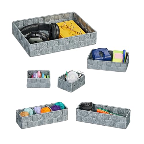 Relaxdays Förvaringskorg, set med 6, korgar i 4 storlekar, flätade, plast, metallram, korgar badrum, grå