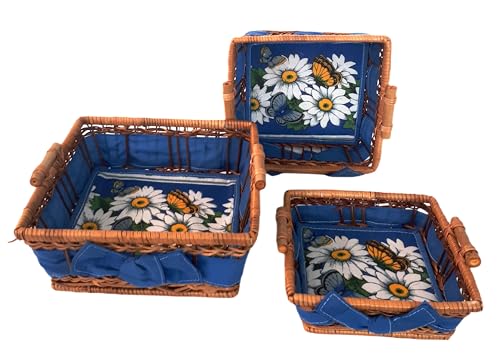 Comarco Sa Set med 3 fyrkantiga flätade korgar och tryckt tyg (22x22x9 cm - 20x20x7,5 cm - 17x17x6 cm)